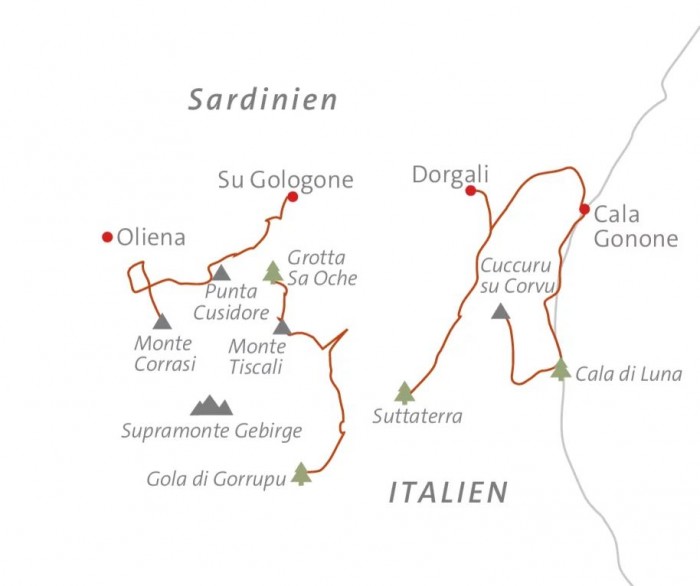 Die Routen sind schlecht bis mittelmäßig markiert und verlaufen oft auf unebenen Wegen, kleinen Pfaden im Gebüsch und selten auf kleinen Schotterstraßen. Einige Wanderungen (wie z.B. Monte Tiscali) sind recht anspruchsvoll, mit einigen (leichten) Kletterabschnitten. In diesem abgelegenen Kalksteingelände finden Sie unterwegs keine Trinkbrunnen oder Dörfer.Insellandschaften und die Wildnis des Landesinneren heißen Sie auf Ihrer Reise durch Sardinien willkommen. Erblicken Sie die über 800 Meter hohen Klippen und das kristallklare Wasser des Mittelmeers, das tiefblau schimmert. Tausende von prähistorischen nuragischen Türmen befinden sich hier und da in der Landschaft, die Sie auf Ihrem Weg auf den Monte Tiscali durchstreifen, um ein verstecktes Nuraghedorf zu entdecken. Sie wandern an den rauhen, zerklüfteten Bergrücken der Supramonte Berge entlang und folgen schmalen Wegen durch die spektakuläre Gola di Gorropu Schlucht. Schließlich geht es zum Golf von Orosei, mit seinen 40km faszinierender Küste. Dieses beflügelnde Wanderabenteuer weckt ganz sicher die wilde Seite in Ihnen.