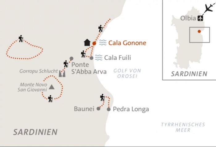 Gemeinsam mit einer kleinen Gruppe Gleichgesinnter entdecken wir auf abwechslungsreichen Wanderungen jeden Tag neue Facetten Sardiniens. Unser komfortables Standorthotel in Cala Gonone ist dabei der ideale Rückzugsort. Mit leichtem Tagesrucksack brechen wir nach dem Frühstück auf, während unser Hauptgepäck im Zimmer bleibt. Ein privater Transfer bringt uns zu den schönsten Ausgangspunkten unserer Touren durch wilde Küstenlandschaften und einsame Bergregionen. Mittags genießen wir regionale Spezialitäten in einem lokalen Restaurant, am Nachmittag bleibt Zeit zum Entspannen am Strand oder auf der Hotelterrasse mit Meerblick.